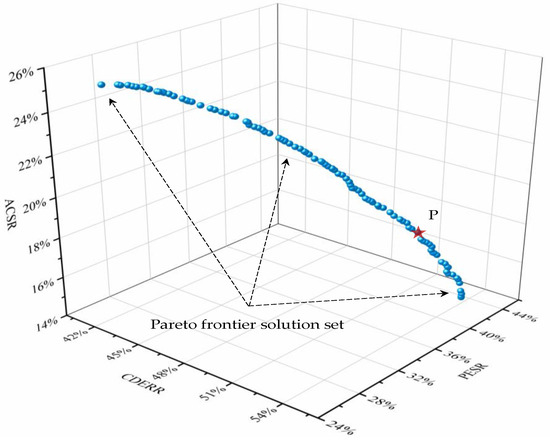 The Pareto optimal solution set was acquired by running the multi-objective optimization algorithm program. The performance indicators of the optimal solution are shown in Figure 5. The value of each coordinate axis represents the performance of the optimization target, and each point is the solution obtained by NSGA-II, which forms the Pareto frontier. The subjective selection solution considers that the environmental, economic and energy efficiency have the same weight, so the point P in the figure with the largest total indicator value was selected as the optimal solution for the performance assessment analysis. After the optimization of capacity configuration and operation strategy, IES achieved performances of ACSR, PESR and CDERR of 17.3%, 39.8% and 53.8%, respectively.