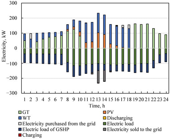 Power dispatching analyses can clarify the operational status of electrical equipment under optimal configuration and show the interaction between supply and demand. Figure 6 shows the energy dispatch status of the electric source and load demand in a typical day. From 1:00 to 7:00, the electricity generated by the WT was not enough to meet the demand of electric consumption, and photovoltaic electricity generation did not meet the operational conditions; thus, the GT generated electricity under partial load. At the same time, part of the electricity bought from the grid met the electricity load. From 8:00 to 10:00, as the electrical load increased significantly, the power generation of WT, PV and GT jointly met the electrical load. From 11:00 to 18:00, the IES gave priority to the utilization of renewable energy. Due to the low economy and energy efficiency of the GT under low load, the GT was shut down. From 13:00 to 15:00, part of the electricity was stored in the battery, and the surplus was injected into the grid. Conversely, from 16:00 to 18:00, supplementary power was supplied by batteries and the grid. From 19:00 to 24:00, solar radiation and cut-in wind speed could not meet the renewable power generation conditions. Therefore, both the building electrical load and GSHP electrical load were supplied by GT.