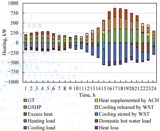 The heat dispatch shown in Figure 7 reveals the heat source and heat demand in a day. From 1:00 to 6:00, the ambient temperature at night was relatively low. The heating load of the hospital was greater than the cooling load. Part of the chilled water was stored in the WST. However, the total load demand was small, resulting in waste heat generated by the system. From 7:00 to 9:00, ACH directly burned natural gas to drive the cycle to produce domestic hot water to meet the relatively large domestic hot water load. The WST released chilled water, and the ACH and GSHP jointly met the cooling load and heating load. There was no heating water load in the hospital after 10:00. From 10:00 to 15:00, the GT generated less waste heat at a low load rate. Therefore, the GSHP and WST met most of the cooling load. From 16:00 to 21:00, due to the large electrical load, the GT generated a lot of waste heat while generating electricity. Part of the waste heat drove the AC/H to produce domestic hot water and chilled water. However, the cooling capacity of the AC/H accounted for only about 0.34, resulting in a lot of wasted heat. From 22:00 to 24:00, as the waste heat generated by the gas turbine decreased, part of the natural gas entered the ACH to burn and generate heat to drive the circulation to produce domestic hot water. The cooling load demand was relatively reduced, and the insufficient cooling load was met by the WST.