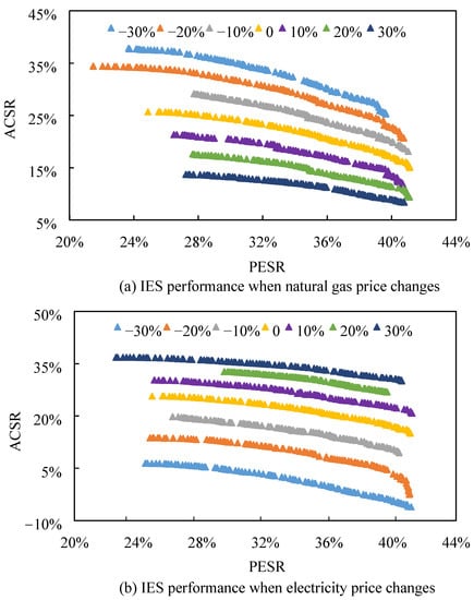 Analyzing the effects of energy price changes on system performance is vital for exploring IES. Figure 8a,b shows the direct impact of changes in natural gas prices and electricity prices of the grid on ACSR and PESR. The different colors in Figure 8 represent the prices of energy fuels, which vary from −30% to 30% based on every 10% change. All the points are optimal solutions under different fuel prices. The optimized solution set showed that as natural gas prices increased, ACSR decreased and PESR remained almost unchanged. On the contrary, as natural gas prices increased, ACSR increased, and PESR was practically constant. The reason for this may have been that the evaluation index is a relative value. When the electricity price increases, the cost saving of IES is faster than the cost increases of SP, which leads to an increase in ACSR. However, when natural gas prices increase, the cost savings of IES are slower than the cost increases of SP, which leads to a decrease in ACSR.