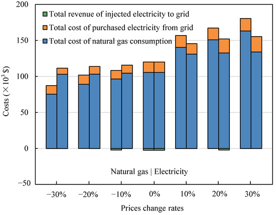Natural gas processes had a more prominent influence on the operating cost of the IES compared with shifts in electricity prices. The utilization and distribution of natural gas is critical for the performance of the IES proposed in this paper, and changes in natural gas prices directly affects the optimization objective.