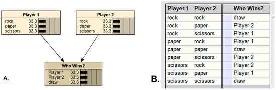 The two-player simultaneous-play game of Roshambo, as represented by a Bayesian network (A), with the conditional probability table predicting the outcome (B), as programmed in Netica (Norsys Inc., Vancouver, Canada, www.norsys.com, accessed on 7 April 2021).