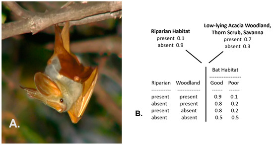 This first case follows an example from Trueblood et al. [57], pertaining here to the depiction of the habitat conditions of the yellow-winged bat (Lavia frons), a mostly solitary species (Figure 3A) found in sub-Saharan tropical Africa. Yellow-winged bats typically favor narrow forest gallery riparian conditions within low-lying acacia woodlands, thorn scrub, or savanna environments [58]. Thus, a simple conditional probability table can depict their habitat values (probabilities of suitable habitat), as shown in Figure 3B (the values specified in the table are hypothetical and based on my personal observations of the species in east Africa, as no formal probability model has been developed for this species). This table is the basis for a simple traditional Bayesian network.