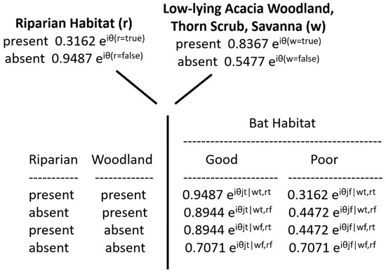 This is equivalent to the Law of Total Probability in Bayesian calculus, in which, among i states, . Thus, the full representation of the quantum conditional probabilities is denoted using the above equations, as shown in Figure 4. The prior probability values of the presence or absence of riparian habitat and the woodland, scrub, or savanna habitat are now each shown as the product of a constant scalar (being the square root of the classical conditional probability values), with factors using the phase of the amplitude (noted above). For example, the overall probability of a riparian habitat being present, as shown in the traditional Bayesian network (Figure 3), is 0.1; its square root is 0.3162, and the factor for the phase of the amplitude is denoted as . In a similar way, the quantum conditional probability values are also shown using the same kind of square-root converted scalar, but with the phase of the probability amplitudes which include combinations of the conditions of the two kinds of habitats. This specification constitutes the general solution space for the EcoQBN representation. Specific solutions depend on the base probabilities (Figure 3), and on the amplitude phases which pertain to the conjunctions of the values of the two habitats. As additional habitat categories and other resource-selection sequences are added, the EcoQBN for yellow-winged bat habitats would be far more efficient than a traditional BN, which would require many additional nodes, links, and probability values.