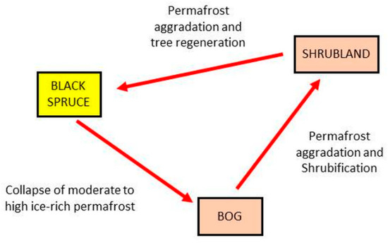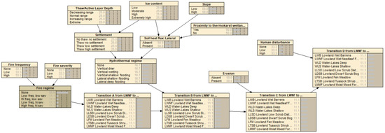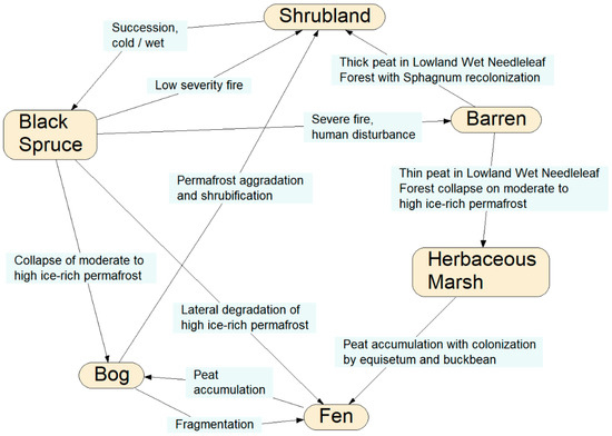 In a simple depiction, consider one subset of the full transition network (Figure 7) in which black spruce forest can change into a bog under the thaw and collapse (thermokarst) of permafrost; the bog can become shrubland under the subsequent aggradation of permafrost and peat with conversion from moss-lichen or herb-grass conditions to shrub-dominated conditions; the shrubland can again become black spruce forest under further permafrost aggradation and tree regeneration. This simple three-state process now represents an intransitive network, as with roshambo, and can be modeled using the quantum state-transition formulae presented earlier. However, this figure contains a cycle, so it cannot per se form a BN, as this violates the requirement that BNs must be acyclic, unless they are self-replicated.