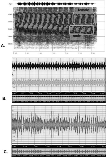 Entrainment without synchrony occurs as song duetting in birds, specifically what is termed ‘antiphonal singing’, in which the male and female are so tightly coordinated that they sound as one, as is most commonly heard in tropical birds. An example is the marbled wood quail (Odontophorus gujanensis), shown in a time-based sound spectrogram in Figure 8A, in which the male’s lower-frequency notes are immediately followed by the female’s response notes in a rapid, entrained fashion, even as the entire series slows. An example of entrainment with synchrony is the chirping calls of field crickets (Gryllus sp.), which attain unison (Figure 8B). Another novel example is the chirping calls of Vaux’s swifts (Chaetura vauxi) within a colony (Figure 8C); in this case, the chatter begins rather randomly, but soon attains a sustained entrainment and synchrony, perhaps serving some group behavior or colony-recognition function. In general, signals showing entrainment with synchrony generally conform to the achievement of a sort of amplified mutual resonance, such as with multiple metronomes on a balanced platform [61], walking on a suspension bridge [62], and many other cases [56,63,64].
