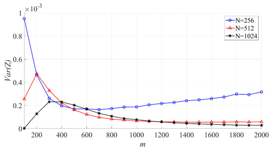 The change of sample entropy variance of the BPSK signal with noise when is fixed ( = 500, = 256, 512, 1024).