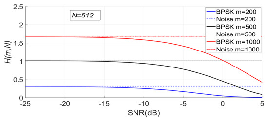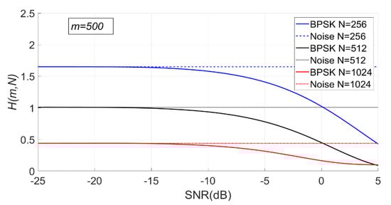 The change of PSER entropy of the binary phase shift keying (BPSK) signal with noise when is fixed ( = 200, 500, 1000, = 512).