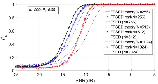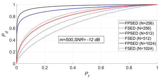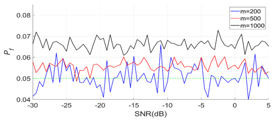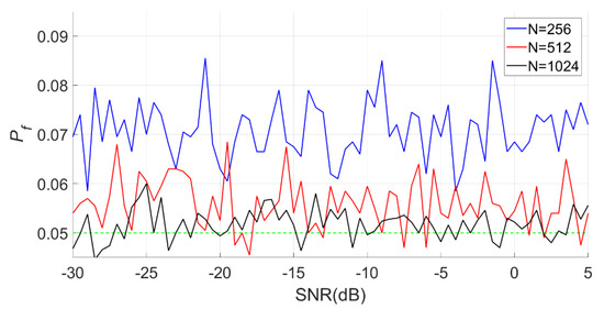 It can be seen from Figure 23 and Figure 24 that when is fixed, a larger does not necessarily imply a better detection performance. The detection probability when is 1024 is lower than that when is 512. However, the detection performance of the full spectrum energy detection method will improve with the increase of .