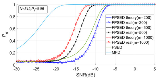 It can be seen from Figure 20 and Figure 21 that the detection probability of the PSER entropy detector is obviously better than that of the FSED method when is 1000. However, when is 200, the detection performance is lower than that of FSED. There is no doubt that the detection performance of matched filtering is the best.