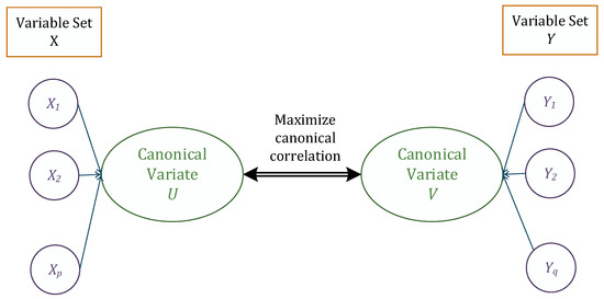 Canonical correlation analysis is a multivariate statistical technique to study correlation between two sets of variables [48,49]. Suppose we have p variables in one set and q variables in another set . Then observed variables in both sets are linearly combined to form a set of canonical variates U and V defined as: