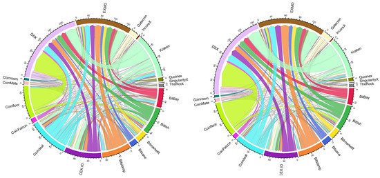 The network of crypto-exchanges with estimated pre-tax and after-tax arbitrage flows between them are correspondingly illustrated in Figure 6. The direction of arrows shows the flow of arbitrage from crypto-exchange where a crypto-asset was bought to the crypto-exchange where it was sold, while the width of arrow represents the arbitrage in the monetary value. The color of the vertex relates to the estimated arbitrage ratio (see Equation (2)). Specifically, the more violet a vertex is, the more outgoing links the exchange has, and vice versa, the more red a vertex is, the more incoming links it has. This implies that Gatecoin, Coinfloor, and Bitsane are the exchanges where arbitrage has been initiated, while EXMO and DSX are seen as exchanges where it has been marketed.