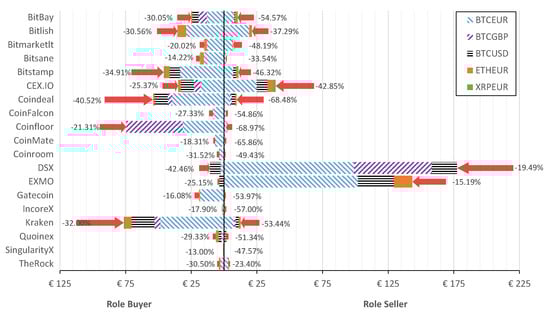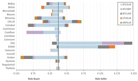 Figure 4 shows that historically the highest arbitrage of €112.277M was generated in Kraken, where the crypto-assets were purchased. The second largest potential profit from arbitrage, exceeding €92M, is determined in Coinfloor. Switching the roles, one can observe that DSX is the exchange where the selling of crypto-assets generated arbitrage above €220M, which is followed by EXMO that resulted in arbitrage of around €170M. There are seven exchanges (BitBay, Bitlish, Bitstamp, CEX.IO, Coindeal, Coinfloor, and Kraken) that generated arbitrage for buying over €3M. However, there existed only five exchanges (Bitlish, CEX.IO, Coindeal, DSX, and EXMO), where the total amount for closing arbitrage is over €30M. The latter two potentially generated close to €390M of arbitrage (over 60% of all potential arbitrage) during the considered period. This indicates that the market is fragmented and the closing of arbitrage is dominated by two players, i.e., DSX and EXMO crypto-exchanges.