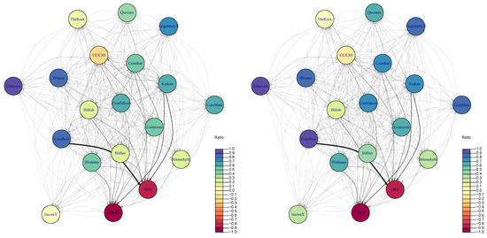 It is interesting to note that there are no significant differences in the network if we consider before- and after-tax arbitrage opportunities just by looking at Figure 6 left and Figure 6 right, which look nearly the same. However, as it was pointed out in Table 2 and at the end of Section 4.2 that taxes have a significant impact on the magnitude of arbitrage (on average 61.42% of potential arbitrage is profitable), i.e., specifically on the weights of network links. Despite visual similarities of graphs before (Figure 6 left) and after (Figure 6 right) taxes, the arbitrage possibilities are different in few aspects.
