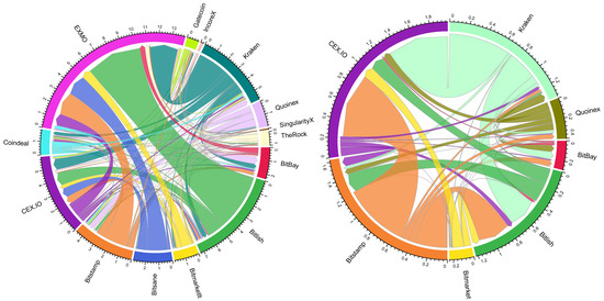 The following figures represent the arbitrage network of ETHEUR and XRPEUR crypto-currencies (see Figure 7). During the period analyzed, there was no ETHEUR arbitrage observed in CoinFalcon, Coinfloor, CoinMate, Coinroom, and DSX crypto-exchanges. Meanwhile, the arbitrage on XRPEUR was only observed in BitBay, Bitlish, Bitmarketlt, Bitstamp, CEX.IO, Kraken, and Quoinex crypto-exchanges.