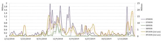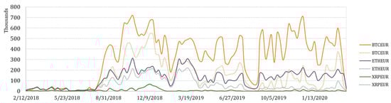 To explore arbitrage opportunities over time, the collection of variables that represent weekly arbitrage opportunities in terms of total arbitrage value, number of transactions, and average transaction value for BTCEUR, ETHEUR, and XRPEUR, have been measured. Moreover, the pre-tax and after-tax arbitrage opportunities have been also estimated. Their variation over a 2-year period is depicted in Figure 8, Figure 9 and Figure 10.