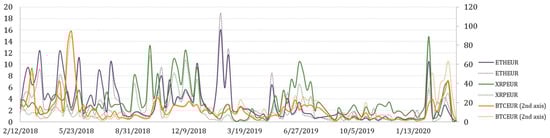 To better understand what might be driving the arbitrage opportunities over time, we include some crypto-market variables that signal about their price change and volatility observed within s week. Therefore, weekly log-returns for dominating currencies such as BTCEUR, BTCUSD, ETHEUR, XRPEUR, USDEUR, and GBPEUR have been estimated. Additionally, CRIX, which is seen as a benchmark for the crypto-market, has been also measured [50].