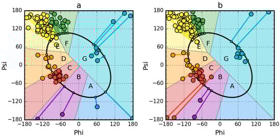 - Roterman, I. The geometrical analysis of peptide backbone structure and its local deformations. Biochimie 1995, 77, 204–216. [Google Scholar] [CrossRef]