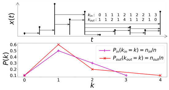 In order to further detail the dynamics between nodes, degree distributions play a fundamental role. The degree distribution of a graph describes the probability of an arbitrary node to have degree k (i.e., k links) [50], and it becomes absolutely necessary to measure the difference between and to understand the incidence of the action of time on the process that originates the series (see Figure 1 for an illustration of both degree distributions).