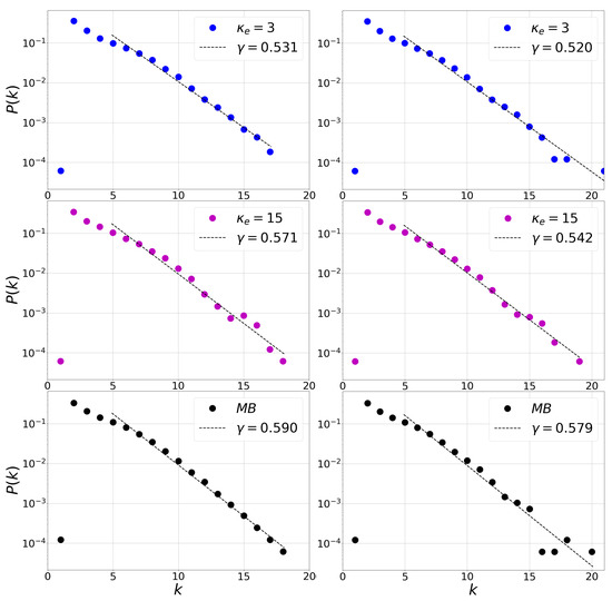 We apply the HVG method to study the time series of magnetic fluctuations that were obtained from the PIC simulations. When considering the Maxwellian and Kappa distributions, we follow the HVG algorithm and build complex networks for three cases: Maxwellian distribution (thermal equilibrium with electrons), 3 (non-thermal electrons), 15 (non-thermal electrons, but closer to the equilibrium), while using the original and the detrended time series (see Figure 2). First, we build the complex network and calculate the in-going and out-going degree distribution for each time series, in order to characterize this distribution for each case. In this sense, the probability distribution of the degree gives information that is related to the correlations in a process, in this case, time correlations. According to the theorem for uncorrelated time series [49], the degree distribution of the horizontal visibility graph that is associated with a bi-infinite sequence of independent and identically distributed random variables extracted from a continuous probability density is with . When the results move away from this critical value we are in the presence of correlations and this value is a border between correlated and chaotic stochastic processes, i.e., characterizes a chaotic process, whereas characterizes a correlated stochastic one [42].