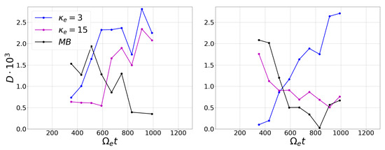 Figure 4 shows that the dissipative degree of the system increases as the value of decreases and the distribution function departs from the Maxwell–Boltzmann equilibrium. In Figure 4 (left), the processes for is reversible, case close to thermal equilibrium. Meanwhile, in Figure 4 (right), all of the distributions correspond to reversible processes by reducing the background trend. This last result could be explained due to the fact that, independent of the value of , all of the considered distributions are steady state solutions of the Vlasov equation. Finally, to further analyze the relationship between the parameter and the KLD, we compute the time evolution of D, as shown in Figure 5. Figure 5 (right) show the same behavior found above, exhibiting a decrease in the value of the divergence for the Maxwellian distribution, whereas, for , this value tends to increase. That is, given the initial conditions of the simulation, and Maxwellian coincide in their behavior over time towards a low degree of divergence, while evidently presents a behavior to the opposite extreme.