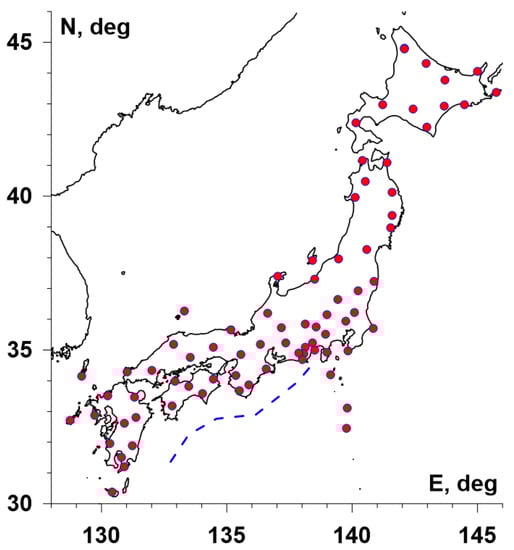 Vertical seismic oscillations data with sampling rate 1 Hz were used for the analysis. These data are accessible from the source [] for 78 seismic stations of the network F-net in Japan. For the analysis, a time interval from the beginning of 1997 up to 31 March 2021 was selected. Figure 1 presents positions of the network stations and the location of the Nankai Deep Trench, which is the northern boundary of the Philippine tectonic plate.