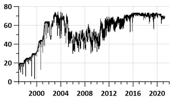 Figure 2 presents the graph of working stations each day during the considered time interval. The seismic station is considered working within the current day if there are no gaps during this day. One can see that the number of operable stations at the initial time fragment (1997–2001) is rather small. This influences the reliability of further estimates. Nevertheless, the result of data processing should not be removed from the analysis. Particularly, median values of seismic noise properties are rather stable to the number of working stations.