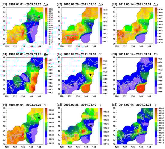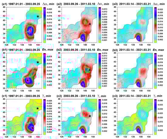 The peculiarities of spatial distribution of the wavelet-based index , as can be seen from a comparison of Figure 3a1–a3,c1–c3, basically coincides with the main features of spatial distribution of the parameter. However, it should be noted that their calculation is based on completely different principles. Therefore, the parameter seems to provide additional information and their mutual consideration is important because estimations of these parameters are based on different approaches. It should be noticed that index in Figure 3c3 has low values in the region of the previous Tohoku events (compared with Figure 3c2. This could be the consequence of the preparation of two earthquakes that occur in the aftershocks region of the Tohoku event: on 13 February 2021 and on 20 March 2021. In addition, the Tohoku aftershocks region has lower values of in Figure 3a3 and higher values of entropy in Figure 3b3 for the same reason.