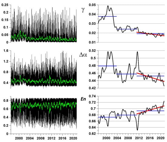 Left panel presents graphs of daily median values of seismic noise parameters , and , green lines are graphs of running average of the length 57 days. Right panel presents corresponding results of deep smoothing of median daily values by Gaussian kernel with bandwidth 182 days, red lines present linear trends of smoothed values after 11 March 2011. Horizontal blue lines present mean values of seismic noise statistics for three time intervals: 1 January 1997–25 September 2003, 26 September 2003–3 October 2011, and 14 March 2011–31 March 2021.