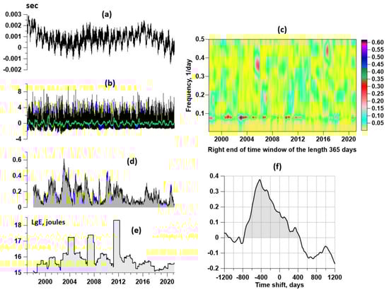 Figure 6a presents a graph of the length of day (LOD), which was taken from the source []. Figure 6b is a graph of the first principal component of daily median values of seismic noise parameters (Figure 4, left panel), estimated in the time window of the length of 365 days. Figure 6c presents a time–frequency diagram of the evolution of squared coherence (18) between LOD and the first principal component in a moving time window the length of 365 days with an offset of 3 days. Bursts of coherence are concentrated within the narrow frequency band with periods from 11 up to 14 days. Figure 6d is a graph presenting maximum values with respect to the frequencies of the squared coherence. Figure 6e is a graph of the decimal logarithm of the seismic energy release (joules) in the vicinity of the Japan Islands: , . Information about seismicity was taken from the source [].