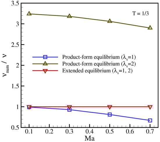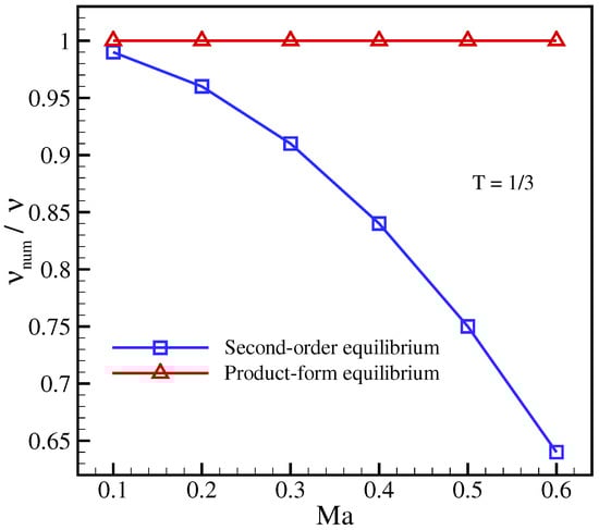where is the advection Mach number, is the amplitude, is number of grid nodes in the y direction, . The nominal kinematic viscosity is set to . Periodic boundary conditions are imposed in both x- and y- directions. The numerical viscosity () is measured by fitting an exponential to the time decay of maximum flow velocity . In this special case, the diagonal anomaly (30) is dormant and does not trigger any spurious effects because the derivatives and both vanish. Consequently, the extended equilibrium (33) becomes equivalent to the product-form equilibrium (25) in this case.