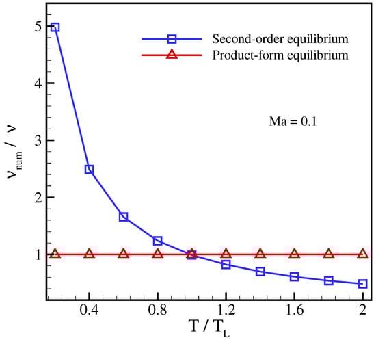 In order to compare with the standard LBGK, the standard velocities were used in this simulation. Figure 1 and Figure 2 show the importance of using the product-form equilibrium (25) as opposed to the conventional LBGK model with the second-order equilibrium. A strong dependence of the viscosity on the reference frame for the second-order equilibrium can be seen in Figure 1, where the viscosity drops with increasing advection Mach number. This well-known artifact of the second-order equilibrium is due to the non-vanishing anomaly in the off-diagonal moments and, unlike the diagonal anomaly, is caused only by the approximate treatment of the product-form equilibrium. Moreover, as shown in Figure 2, even at a small enough velocity this spurious feature improves only at the lattice reference temperature . In contrast, as is shown in Figure 1 and Figure 2, the product-form equilibrium of the present model is able to accurately predict the viscosity in this setup for a wide range of temperatures and reference frame velocities.