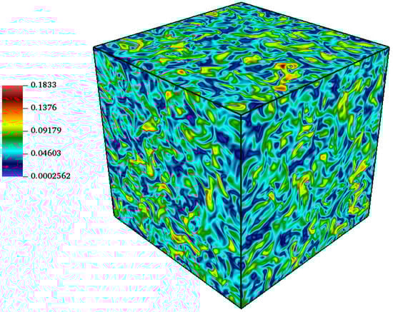 where is the wave number, is the wave number at which the spectrum peaks and A is the parameter that controls the initial kinetic energy []. The initial velocity field is generated using a kinematic simulation as proposed in []. The turbulent Mach number is defined as