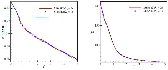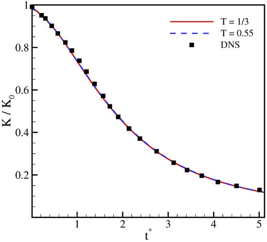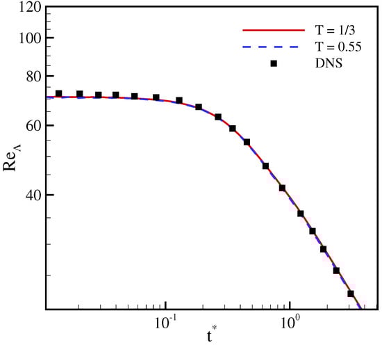 normalized with its initial value (), and of the Taylor microscale Reynolds number are compared in Figure 5 and Figure 6 with results from direct numerical simulations (DNS) []. It is apparent that the two working temperatures yields almost identical results that agree well with the DNS simulation. This indicates that the correction terms do not degrade the accuracy of the model at higher temperatures, even though the magnitude of error term (30) is higher due to amplification of the linear term.
