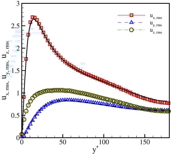 For a more thorough analysis, we compare the root mean square of the velocity fluctuations with the DNS data in Figure 13. Here, and and are defined in a similar way. It can be seen that the results are in excellent agreement with the DNS results []. This demonstrates that the LBGK model, also in the presence of a severe anisotropy triggered by stretched velocities, can be used for the simulation of high Reynolds number wall-bounded flows once the corrections are incorporated with the extended equilibrium.