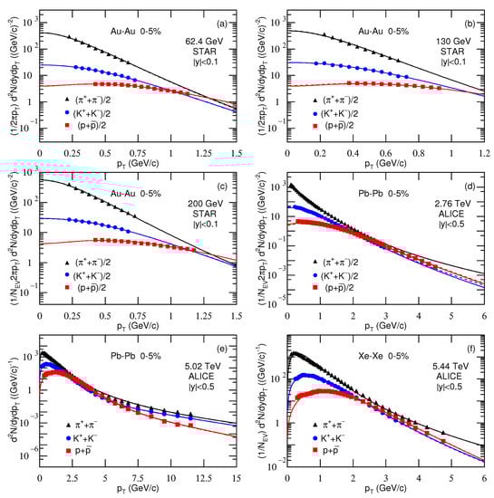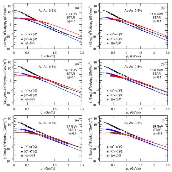 - Abelev, B.I.; Aggarwal, M.M.; Ahammed, Z.; Anderson, B.D.; Arkhipkin, D.; Averichev, G.S.; Bai, Y.; Balewski, J.; Barannikova, O.; Barnby, L.S.; et al. Systematic measurements of identified particle spectra in pp, d+Au, and Au+Au collisions at the STAR detector. Phys. Rev. C 2009, 79, 034909. [Google Scholar] [CrossRef]