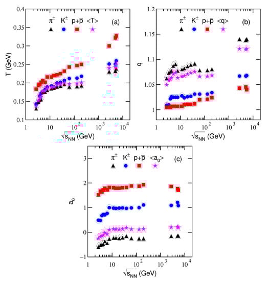 - Tawfik, A.N.; Yassin, H.; Abo Elyazeed, E.R. Extensive/nonextensive statistics for pT distributions of various charged particles produced in p+p and A+A collisions in a wide range of energies. arXiv 2019, arXiv:1905.12756. [Google Scholar]