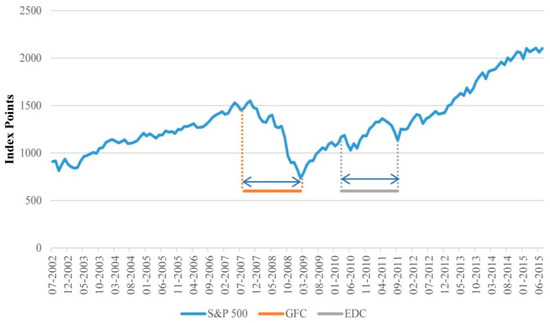 To examine the effect of excessive volatility on the performance of the portfolio, we define subsamples for the global financial crisis (GFC) and the European debt crisis (EDC) periods. The GFC spans the period August 2007 to February 2011, and the EDC comprises the period March 2010 to September 2011. The impact of the EDC on U.S markets was of a smaller magnitude than the GFC as only major events of the EDC sparked uncertainty in the U.S, which hindered the S&P 500′s recovery from the GFC. These events include the Greek bailout in May 2010, the Ireland bailout in November 2010 and speculation of default by major European banks coupled with the rise in the probability of default by Italy and Spain around the third quarter of 2011 [51,52]. The EDC concluded by late 2012 to early 2013, where levels of systemic risk returned to normal levels [51]. Our EDC sample spans the period March 2010 to September 2011, which includes the major events that had a considerable impact on the S&P 500 index. Figure 1 illustrates the performance of the S&P 500 index during the overall sample period.