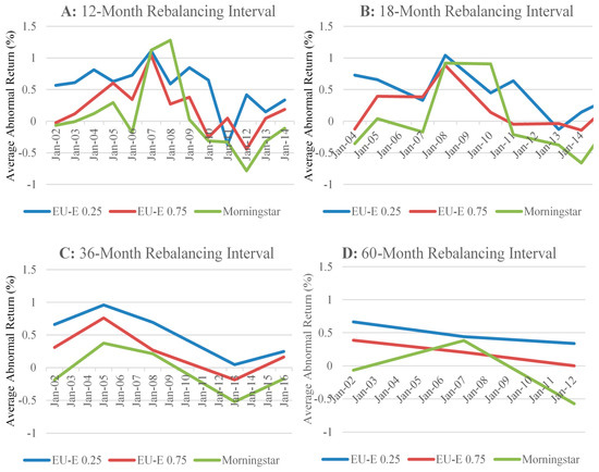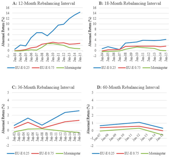 We find that the significance, both economic and statistical, of the cumulative average abnormal return for each model decreases as the length of the rebalancing interval increases. Panel B of Figure 6 shows the cumulative average abnormal return for each model during the overall sample period using 18-month rebalancing intervals. For the portfolios constructed using the ratings based on the EU-E (λ = 0.25), the cumulative average abnormal return falls to 4.18%. Likewise, the cumulative average abnormal return earned by the portfolios constructed using the ratings based on the EU-E (λ = 0.75) and Morningstar declines to 1.64% and −0.07%, respectively. Similar declines for each rating model are observed in Panels C and D of Figure 6, which illustrate the 36- and 60-month rebalancing intervals, respectively.