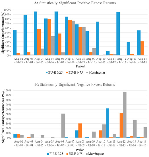 Panel A of Figure 4 shows that the portfolios based on Morningstar ratings perform particularly well, earning an average excess return relative to the S&P 500 of 1.13% and 1.27% in the periods to July 2008 and July 2009, respectively. This is compared to the fall in excess return by the ratings based on the EU-E (λ = 0.25) and EU-E (λ = 0.75) of 1.11% to 0.59% and 1.04% to 0.27%, respectively over the same period. The abnormal return earned by the portfolios constructed using Morningstar ratings during this period does not persist. This result is further complemented by Figure 5, where at only three intervals do the Morningstar ratings portfolios record a notable statistically significant and positive excess return: August 2005–July 2006 (42%), August 2007–July 2008 (76%), and August 2008–July 2009 (62%). In contrast, the proportion of portfolios based on Morningstar ratings, which earn negative and significant excess returns, is only recognizable in the August 2006–July 2007 (51%) and August 2012–July 2013 (97%) intervals. At other times, no significant difference from the return of the S&P 500 is recorded. This finding demonstrates that the 5-star category of Morningstar ratings is unable to select the best performing funds consistently.