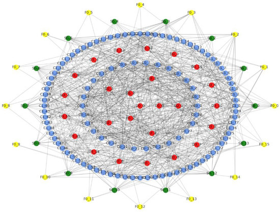 The real connection strategy determines the attack and sensor nodes; that is, the outermost C2 nodes of the C2 network belong to the unit of the combat formation, which is not separated from other attributes of the formation, such as attack or sensor attributes. Therefore, the leaf nodes of the C2 network are connected with at most one attack and sensor node. Nodes in the attack and sensors subnetwork are shown in