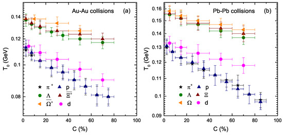 - Lao, H.-L.; Liu, F.-H.; Li, B.C.; Duan, M.Y. Kinetic freeze-out temperatures in central and peripheral collisions: Which one is larger? Nuclear Sci. Tech. 2018, 29, 82. [Google Scholar] [CrossRef]
