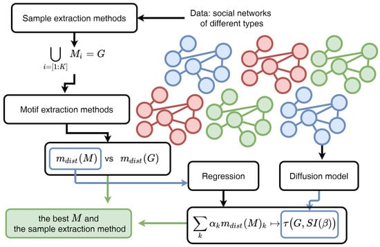 The framework of the appropriate subgraphs search. Sampling methods are used for subgraph extraction, then motif extraction techniques are used for topological verification: Motif distributions for sub- and supergraphs are compared; the regression model on the base of sample motif distribution is used for transient time prediction for the SI diffusion model. The best subgraphs and corresponding methods for topological and functional criteria are evaluated.