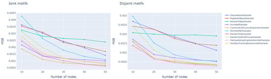 For disjoint motifs, MSE shows lower values for all sizes of samples, varying from 0.0014–0.003 (for 10 nodes) to 0.00025–0.0019 (for 50 nodes), which is on average two times lesser than for the joint motif case, varying from 0.002–0.0043 (for 10 nodes) to 0.0007–0.25 (for 50 nodes) (Figure 2).