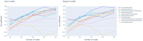 The best prediction is reached for the 40-node subgraph by the shortest path sampler, and for the 50-node subgraph by the degree-based and non-back tracking random walker. For the disjoint motif case, the shortest path sampler still demonstrate the highest quality for 30–50 node samples, and for the 50-node samples non-back tracking and random walk samplers stay at 2nd and 3rd position. Other samplers provide prediction accuracy (R2) below the value of 0.5 (Figure 3).