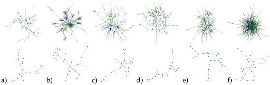 Resulting subgraphs on the corresponding supergraphas and their single versions for the selected topics: (a) Counter strike, (b) Free donut—i like it!, (c) feminism, (d) introvert, (e) pizza, and (f) stop smoking. Node size correspond to its degree, blue nodes highlight subgraphs extracted.