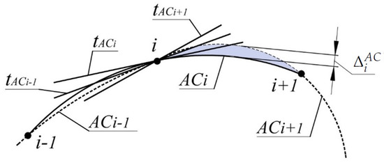The monotonous increase of along the point series allows for interpolating it by the monotone curve along which the values of the radii of curvature increase. The absolute interpolation error is estimated as the maximum distance between the arcs and , bounded by points i and (Figure 1). In the first and the last sections, the value is not defined as and do not exist.