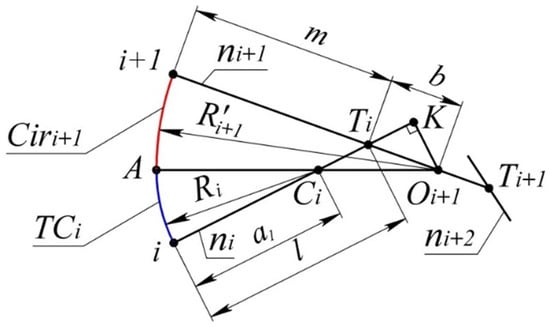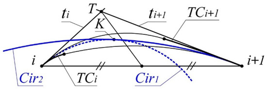 Provided that the radii of curvature along the curve increase monotonously, the minimum radius of curvature at point i equals zero. Here, point i is considered to be the tangent circle of zero radius. In this case, the lower boundary of the interpolated curve is the arc of circle , which is tangent to line at point and passes through point i (Figure 5). The minimum possible radius of curvature that can be assigned at point , is equal to the radius of .