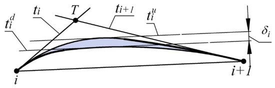 The boundaries of the area of location of the interpolated curve are determined by the procedure presented in Figure 6. The absolute interpolation error in section is defined as the distance between the lines tangent to the upper and lower boundaries of the area of location of the curve and parallel to section .