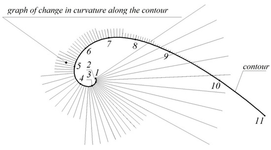 Figure 8 represents the contour formed in the CAD system Solidworks, the characteristics of which are presented in Table 4. With the aid of the CAD system, the graph of change in curvature along the contour is formed. The resulting graph shows its monotonous change and irregular variation at joining points of the arcs of circles. The possibility of increasing the number of arcs forming the contour makes it possible to reduce arbitrarily the difference of the curvature values at their joining points.